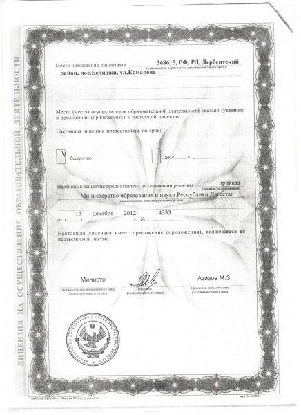 | Адрес местонахождения образовательной организации* | 368615, Республика Дагестан, Дербентский район, пос.Белиджи, ул. Комарова |